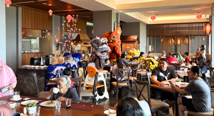 BWI24JAM.CO.ID, Banyuwangi - Pagi itu, suara tambur, simbal, dan gong terdengar di area Ijen Restaurant, Kokoon Hotel Banyuwangi, Selasa (17/02/2026). Lima barongsai tampil bersamaan, menarik perhatian para tamu yang sedang sarapan.