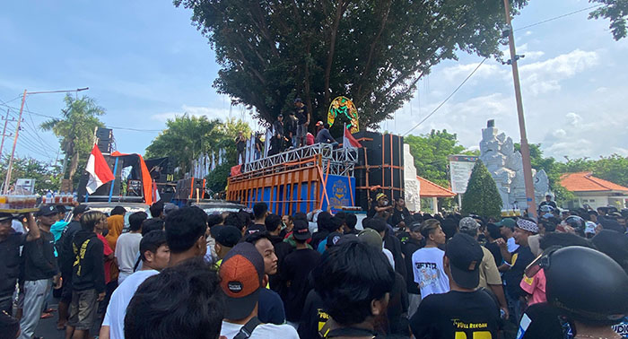 Massa yang tergabung dalam Keluarga Besar Sound System Banyuwangi (KBSB), pekerja seni, dan pelaku UMKM, melakukan aksi damai dengan menyampaikan tuntutan mereka melalui orasi yang disuarakan serempak melalui sound system.