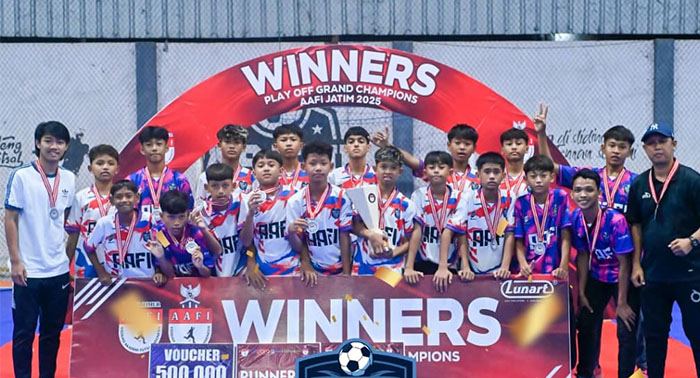 BWI24JAM.CO.ID, Banyuwangi - Kabar membanggakan datang dari dunia olahraga Banyuwangi. Tim futsal muda asal Bumi Blambangan, Rafi FA (Futsal Academy), berhasil menembus kejuaraan nasional setelah meraih juara 2 (runner up) pada ajang Play Off Grand Champions Asosiasi Akademi Futsal Indonesia (AAFI) Jawa Timur 2025 kategori U-13.